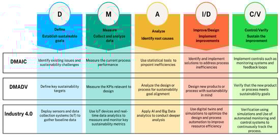 Integrating Lean Six Sigma and Industry 4.0 holds great potential to facilitate sustainable manufacturing practices [12]. Lean Six Sigma provides structured methodologies, such as DMAIC (define, measure, analyze, improve and control) and DMADV (define, measure, analyze, design and verify), which support systematic continuous process improvement by identifying the major inefficiencies and optimization of workflows [13]. Industry 4.0 introduces advanced real-time, data-driven technologies, including smart sensors, machine learning and the Internet of Things, to enable automation and predictive insights [14]. The integration of these paradigms creates a powerful approach, whereby Lean Six Sigma offers a systematic framework for continuous improvement, while Industry 4.0 accelerates the implementation of solutions with advanced analytics and real-time monitoring [15]. For example, the use of predictive maintenance tools supported by the IoT and big data analytics within a Lean Six Sigma framework reduces unplanned downtime and optimizes the utilization of resources [16]. Similarly, digital twin simulations combined with DMAIC’s improve phase enable the virtual testing of proposed changes, ensuring sustainable outcomes with minimal risks [17]. However, this approach is still a developing area of research, with limited studies exploring how these paradigms complement each other to achieve environmental, economic and social sustainability goals [18]. Further research is needed to address the gaps and validation of integrated frameworks through practical applications across diverse industrial contexts [19].