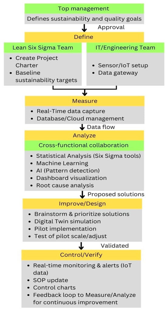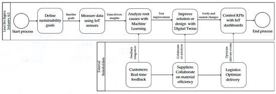 The proposed Lean Six Sigma–Industry 4.0 framework needs to be operationalized effectively through a structured, phase-by-phase implementation path. In the define phase, the main objective is to pinpoint key sustainability or operational challenges and establish the baseline performance metrics. This needs to be led by the Lean Six Sigma team collaborating with top management to set clear goals. The IT and Engineering teams facilitate the deployment of IoT sensors and data acquisition tools on targeted production lines, ensuring the collection of real-time data right from the outset. Cross-functional stakeholders, including those involved in production, the supply chain, quality control and IT, are engaged so that they are aligned in terms of the scope and anticipated outcome. There exists a shared understanding of the performance targets and long-term sustainability objectives. The framework then proceeds to the measure phase to measure the current state of operations to form a robust baseline. The deployed IoT sensors capture key parameters such as defect counts, process speeds and energy consumption at regular intervals and provide an accurate picture of the current performance. This forms a large dataset, and these datasets are then stored securely in cloud solutions, in which they can be easily accessed and analyzed by multiple stakeholders. To make sense of these data, Lean Six Sigma practitioners adopt tools such as SIPOC diagrams or value stream mapping, which are enriched with real-time insights that provide clear information regarding the key inefficiencies in cycle times, lead times or overall resource usage. Through this way of translating the raw sensor data into meaningful metrics, a clear and quantifiable picture of how each stage of the process is performing and where there are gaps can be obtained. The analyze phase uncovers the root cause of identified inefficiencies and validates potential improvement opportunities. In this stage, traditional Lean Six Sigma statistical methods such as Pareto analysis and control charts are integrated with advanced AI or machine learning algorithms to detect patterns within the data that point to recurring defects, unanticipated energy waste or any subtle correlations in the production environment. To further assist in visualizations of these insights, real-time dashboards will be implemented that enable the production and quality engineers to spot the abnormal trends immediately. Once the critical issues are well understood, the improve or design phase focuses on devising and implementing the solutions that address the identified root causes. A cross-functional team will work on the range of potential improvements such as alternative material choices, reconfigured workflows or machine settings. Digital twin simulations support this phase, which allows the data science and engineering teams to model the proposed solutions in a virtual environment, predicting outcomes without risking the current real-world production settings. A pilot test also validates the feasibility and effectiveness of the interventions. The process loops back to further refinements if there are discrepancies between the expected and actual outcomes, and it will be guided by additional analytics from machine learning models. After successful piloting and refinement, the control or verify phase ensures that the improvements are consistently delivering the intended benefits. The key performance indicators such as the defect rates and power consumption are constantly tracked using automated IoT-based monitoring systems and trigger the team with alerts whenever critical thresholds are crossed. To sustain the improvement, the organization formalizes new SOPs (standard operating procedures) to embed the improved process into routine operations. The data generated throughout this stage are then relayed back to previous phases for ongoing calibration, laying the groundwork for continuous improvement. Periodic technology updates and audits serve as checkpoints to monitor the performance of IoT sensors, the tuning of machine learning Models and adherence to SOPs. This will also ensure that all elements remain aligned with evolving production volumes, production mixes or sustainability goals. The entire implementation pathway is a cyclic process in which data-driven decisions, iterative enhancements and stakeholder collaboration converge to solidify the Lean Six Sigma–Industry 4.0 framework as a dynamic, organization-wide force for operational excellence and sustainability. Figure 2 illustrates the flow of activities, people and technologies involved in the framework’s implementation and Figure 3 shows the business process model of framework.
