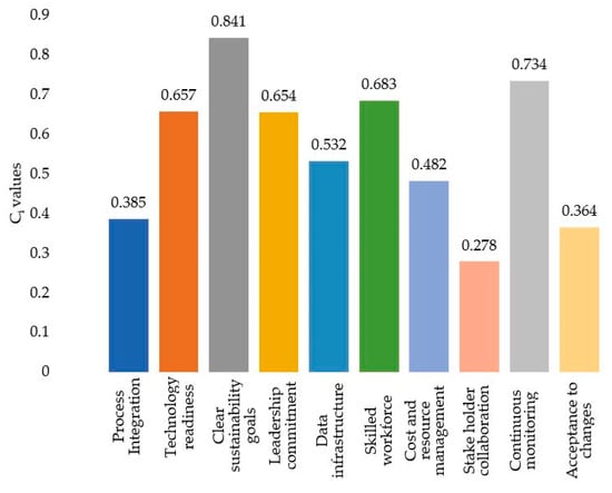 The results from the TOPSIS analysis revealed that setting and following clear sustainability goals emerged as the highest-priority critical success factor. Without a clear direction, efforts towards sustainability are not practical. This aligns with the existing studies, as it underscores the importance of goal setting to focus on resource utilization, progress monitoring and the adjustment of strategies. The second-highest-ranked success factor for the framework’s effective implementation is the continuous monitoring of sustainability metrics and process efficiencies. Proactive decision making can be achieved through continuous monitoring and ensures sustainability practices are optimized over time. The critical role of a skilled workforce is listed as the third priority, followed by technology readiness and leadership commitment. While technology plays a critical role, a skilled and trained workforce is essential for data interpretation, the management of advancement systems and the application of relevant technology to develop innovative solutions to sustainability challenges. Continuous professional development of the workforce in emerging Industry 4.0 technologies and Lean Six Sigma methodologies are also crucial for maintaining workforce competency. The readiness of the organization to implement Industry 4.0 technologies and Lean Six Sigma strategies significantly influences its ability to achieve sustainability goals. At the same time, leadership is crucial for fostering a culture of innovation and sustainability, as well as driving change across the organization. The lower-priority factors, such as process integration, cost–resource management, the acceptance of changes and stakeholder collaboration, also need to be considered while setting plans for the framework’s implementation.