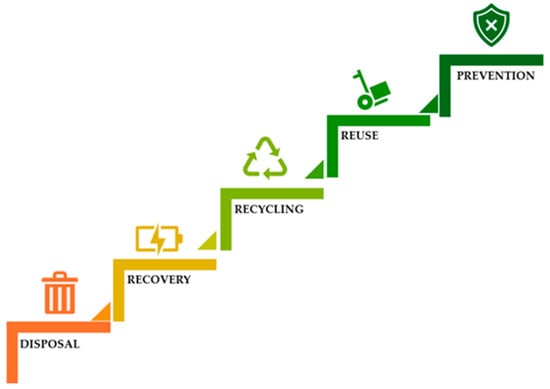 Waste management should be carried out in accordance with the currently applicable standards or legal acts [3]. Legislative provisions may vary between countries or even regions, introducing different restrictions. The first of these is the Waste Framework Directive (2008/98/EC) [12,13]. It requires Member States to develop waste management plans in accordance with the established hierarchy of solutions, which is presented in this article in the form of an inverted pyramid in Figure 1. Due to its formal scope covering nearly 60% of European countries, it is considered decisive in these considerations.
