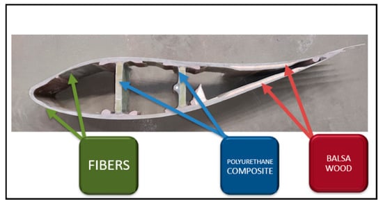 According to a detailed analysis of the material composition of wind turbine blades, the main components are fibers, polyurethane composite, balsa wood, and microfibers [24,25], as shown in Figure 2. The presented fragment of a wind turbine blade is part of the resources of the Research Laboratory of the Faculty of Civil Engineering, Architecture, and Environmental Engineering at Bydgoszcz University of Technology. The core is most often made of balsa wood, as well as PVC and PET. Another component is the thermosetting matrix in various variants. To reinforce the structure, fibers–most commonly glass, carbon, or basalt fibers–are used. Additionally, elements related to assembly or installations are made of metals such as steel or copper (e.g., bolts/wires) [26]. A single wind turbine blade can reach several tens of meters in length, changing its cross-section along its span, and may weigh several tons, which clearly illustrates the significance of the waste management issue once these components reach the end of their service life [27]. In [11], a graph showing the relationship between the blade’s mass and the rotor diameter is presented. In [4], the mass of a wind turbine blade is correlated with its power, giving an example of 19.5 tons for a 2 MW turbine, with further assumptions of 10 tons per MW.