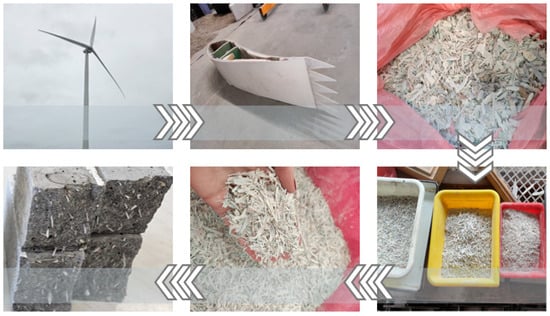 - Abdo, M.; Toumpanaki, E.; Diambra, A.; Comandini, G.; Bank, L. Evaluation of Mechanical Properties of Concrete with Recycled FRP Wind Blade Waste Material. In Proceedings of the 11th International Conference on Fiber-Reinforced Polymer (FRP) Composites in Civil Engineering, Rio De Janeiro, Brazil, 23–26 July 2023. [Google Scholar]