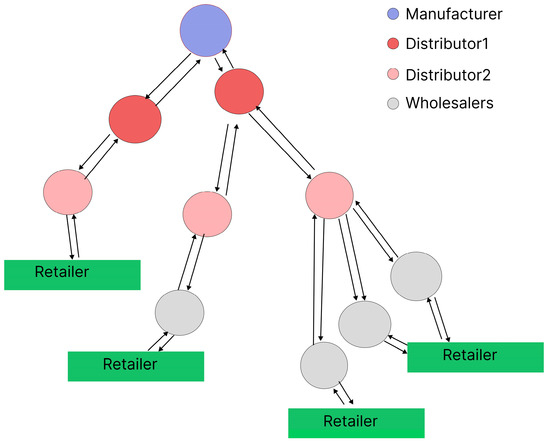 Figure 1 illustrates a hierarchical structure within a supply chain network, depicting the flow of goods from production to the final consumer. At the top of this chain, the manufacturer initiates the process by producing goods that will eventually reach consumers. These goods are then passed through various intermediaries, including distributors and wholesalers, before arriving at different retail outlets. This structured pathway captures the journey of goods, starting from their creation and concluding with consumption. Each level within this hierarchy plays a crucial role, highlighting the coordination necessary to ensure the smooth and efficient movement of goods throughout the supply chain.