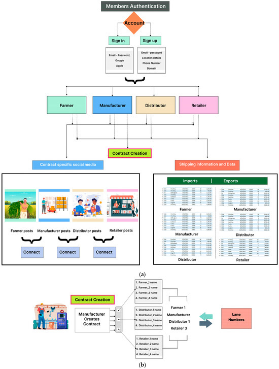 The system design in our research is methodically designed to address the complexities of supply chain operations by enhancing efficiency, security, and user engagement. Firstly, the architectural framework in Figure 2a,b highlights modularity and scalability, breaking the system into discrete modules, including member connections, contract formation, and communication channels. This modularity allows for each component to be developed, tested, and maintained independently, providing flexibility for updates and expansion over time.