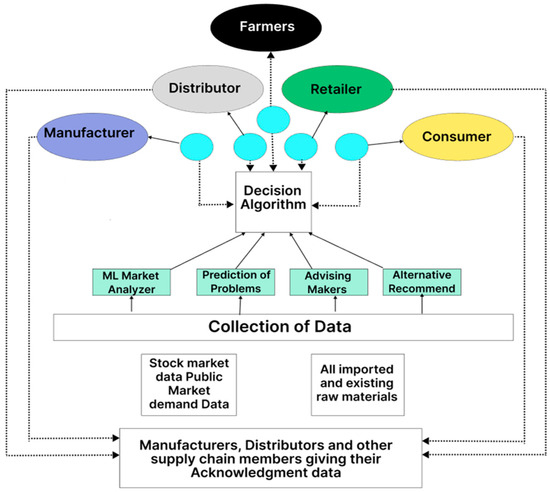 The decision algorithm illustrated in Figure 3 acts as the brain of the supply chain network, managing the flow of information and decision-making among a variety of players, including farmers, manufacturers, distributors, retailers, and consumers. It analyzes the network’s layout and identifies potential collaboration opportunities, helping stakeholders grasp their roles better, form strategic partnerships, and create a more interconnected supply chain. The algorithm pulls together different data sources, like stock market trends, public market demand, and feedback from supply chain participants.