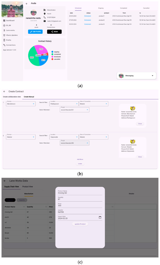Application framework user interface design and functionalities. (a) Profiles, (b) contract creation, and (c) lane work data.