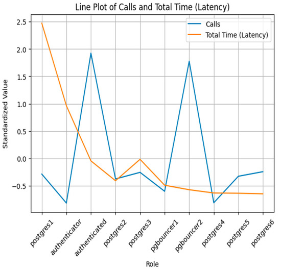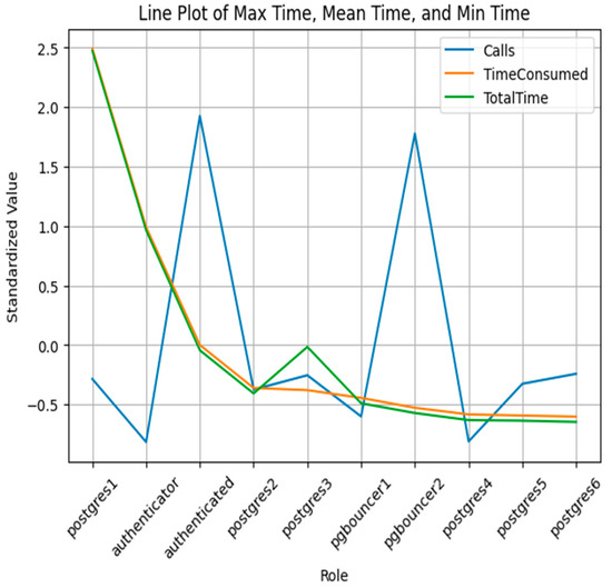 In the plots (Figure 10, Figure 11 and Figure 12), postgres 1, 2, 3, 4, and 5; Authenticator; authenticated; PgBouncers 1; and PgBouncers 2 are queries related to the postgres, Authenticator, authenticated, PgBouncer roles that are maintained confidential in this paper. However, they provide the comparison plots between the columns in the table. All the values are standardized using MinMaxScaler.