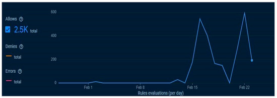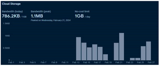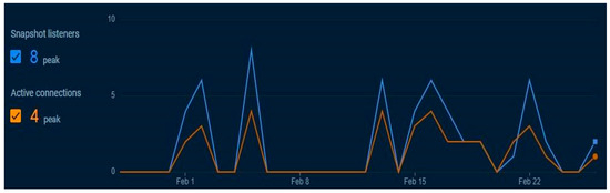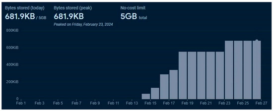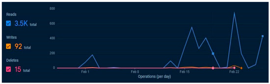 The figures (Figure 13, Figure 14, Figure 15, Figure 16 and Figure 17) provide a comprehensive view of the daily activities conducted during experimentation, with focus on various aspects of system usage, bandwidth speed, transaction volumes, rule metrics, data storage, and more. Figure 15 highlights the predominance of read operations over writes within the implementation of module-1, particularly emphasizing the extensive interaction with Firestore. Meanwhile, Figure 16 showcases the utilization of snapshot listeners, peaking at eight, and they are crucial for maintaining connections between storage and Firestore to effectively manage post references.