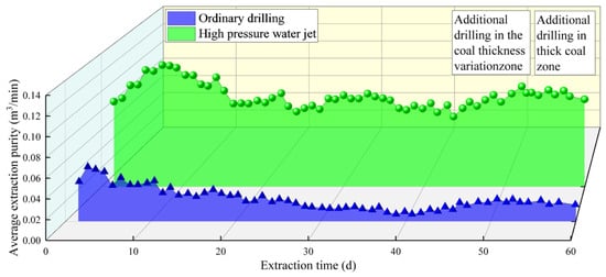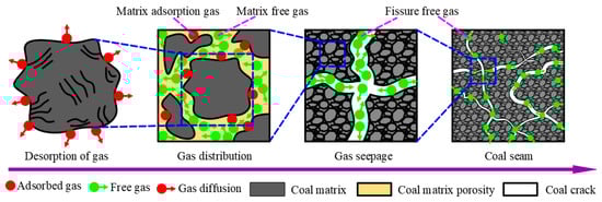 41]. Firstly, the coal surface will desorb the adsorbed gas, under the influence of the concentration difference; the desorbed gas will diffuse from the pores of the coal matrix to the coal fissures, the diffusion of gas being in accordance with Fick’s law of diffusion; and finally, the gas will seep from the coal fissures into the roadway, the seepage of gas being in accordance with Darcy’s law of seepage [