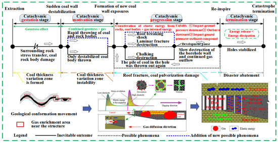 Schematic diagram of the occurrence process of coal–rock–gas complex dynamic disaster.