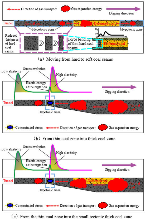 17], and this zone is often the area where both the thickness of the coal seam and the strength of the coal seam change, and the stress, gas, and energy in the interior of the region show uneven distribution, making it very prone to coal–rock–gas dynamic disaster accidents [