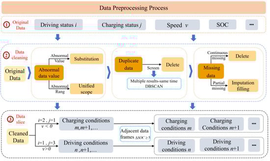 Due to the complex operating conditions of vehicles, various factors can affect the quality of collected data, resulting in abnormal and invalid data in the raw dataset. To ensure the data’s completeness, continuity, and accuracy and to obtain trainable datasets, it is necessary to preprocess the obtained raw dataset. These data processing methods mainly include data-cleaning and data-slicing, as shown in Figure 1. The data cleaning method is used to process and handle abnormal data generated during data collection and transmission, including abnormal values, data duplication, and data loss. The data-slicing method is used to reconstruct and extract driving conditions.