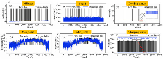 Results of data-cleaning. (a) mileage; (b) speed; (c) driving status; (d) highest temperature; (e) minimum temperature; (f) charging status.