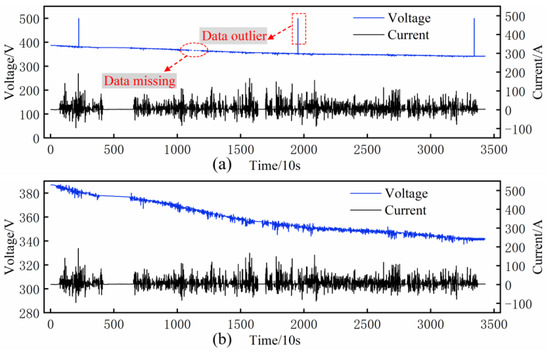 The working conditions of new energy vehicles mainly include driving, charging, parking, and specific working conditions. The driving conditions are complex and varied, while the charging conditions are relatively stable, mainly affecting the changes in the health status of the battery [25]. Therefore, this article reconstructs and extracts these two working conditions through data-slicing methods. Firstly, based on the charging operating conditions satisfying , , and the driving operating conditions satisfying , , the complex driving conditions are analyzed. Subsequently, the complex driving working condition is simplified into charging and driving working conditions. Since the total voltage and total current vary greatly in different traveling segments, direct cleaning will lead to poor results. Then, based on the changes in adjacent SOC values, the charging dataset and driving data are sliced to obtain data segments of a single charging driving condition. Finally, the data segment is processed using the data-cleaning method, and the results are shown in Figure 3a,b.