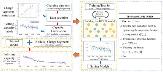Currently, most battery capacity calculation methods are based on the development of cell levels through preset load curves and environmental temperatures. However, in this charging dataset, most charging segments adopt a step charging strategy, with relatively small and step-like changes in charging current. In addition, the randomness of the starting and ending points of SOC values during charging is strong, making it difficult to obtain a complete charging segment. When applied directly under actual driving conditions, these methods may reduce the system-level estimation performance [28]. Therefore, this paper adopts a capacity calculation method that combines Coulomb counting with regional capacity to mitigate the impact of incomplete charging segments and temperature on capacity estimation [29]. Moreover, by analyzing the characteristics that affect capacity, a capacity estimation model under charging conditions can be established to estimate SOH. The SOH estimation method based on charging data is shown in Figure 4. Firstly, select charging segments that meet the capacity calculation requirements. Then, a combination of Coulomb counting and regional capacity is used to calculate the capacity of these fragments, and the results are used as capacity labels. Through further analysis, key features that affect capacity calculation are extracted, and a feature model is constructed based on them. Finally, the Bayesian optimization algorithm is utilized to automatically optimize hyperparameters and establish a BIGRU capacity prediction model for predicting the capacity of the remaining charging segments, achieving capacity estimation for the entire time period.