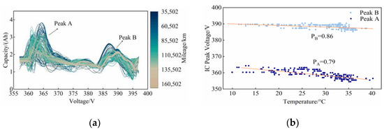 Figure 5a shows the IC processing curve of the vehicle during different cycles. Evidently, the area under a specific IC curve, i.e., the regional capacity, typically declines with increased accumulated mileage. The IC curve exhibits two peaks, designated as peaks A and B, whose heights and voltages can reveal the intricate electrochemical degradation mechanism [30]. Figure 5b illustrates the correlation between average temperature and peak voltage location. The Pearson correlation coefficients of the two peak voltage locations are 0.86 and 0.79, respectively, indicating a strong temperature dependence [31]. Since peak B is less affected by noise than peak A, peak B is selected as the capacity feature to be extracted.