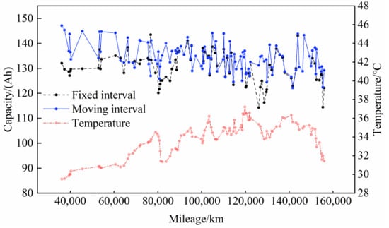 The comparison between the improved regional capacity calculation method and the traditional fixed interval regional capacity calculation method is shown in Figure 6. From Figure 6, it can be seen that the battery capacity calculated by both methods gradually decreases with the increase of mileage. The method based on fixed voltage regions is more susceptible to changes in temperature. In low-temperature environments, at 35,000 km and 75,000 km, the calculated capacity values are relatively small because the fixed region method does not account for the impact of temperature on the peak voltage position of the IC. Conversely, the sensitivity of the capacity calculation method in the sliding voltage region to temperature changes is significantly reduced, and the rebound phenomenon during the capacity decay process more closely aligns with real-world conditions.