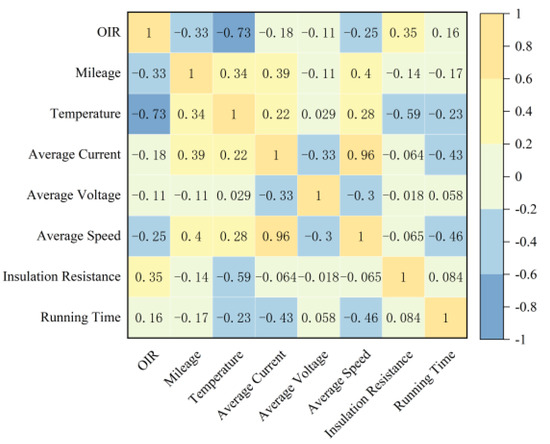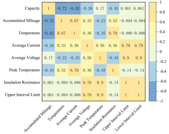 The capacity feature is influenced by various factors such as charging rate, temperature, number of cycles, and charging depth [33]. However, under actual traffic conditions, some data are difficult to test and obtain. Therefore, extracting features that impact capacity based on existing vehicle driving data is necessary. Firstly, based on the characteristics of actual vehicle data, the charging dataset is subjected to feature extraction. Accumulated mileage is selected as a substitute for cycle times, and the average current during charging represents the charging rate. Seven parameters, including cumulative mileage, average total current, and average total voltage, were selected from the dataset as influencing capacity characteristics, and the Pearson correlation coefficient method was used for correlation analysis. Figure 7 shows a high correlation between battery capacity and cumulative mileage, temperature, peak temperature, and average current. However, a significant correlation exists between peak temperature and temperature, so peak temperature is removed. This article ultimately determines the input parameters for the capacity estimation model: cumulative mileage, average temperature of charging segments, and average current of charging segments.