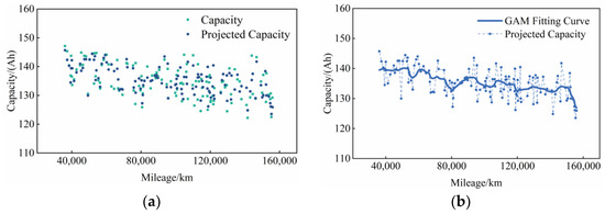 As shown in Figure 9a, there is a significant fluctuation between the actual and predicted capacities. This fluctuation arises from uncertainties such as sensor measurements and SOC estimation errors. Therefore, in order to more accurately describe the degradation trend of capacity, it is necessary to smooth the capacity curve. Due to the non-linear nature of the decreasing trend in capacity, traditional fitting methods often cannot accurately reflect this actual trend. Hua et al. [37] utilized GAM to non-linearly analyze NOx concentration with satisfactory results. GAM reduces the risk of linear modeling by using the smoothing function S(x) to handle the target variable. The specific functional form is obtained through an inverse fitting algorithm. Therefore, this paper used cumulative mileage as an input, and the capacity was denoised by S(x) of GAM. The results are shown in Figure 9b.
