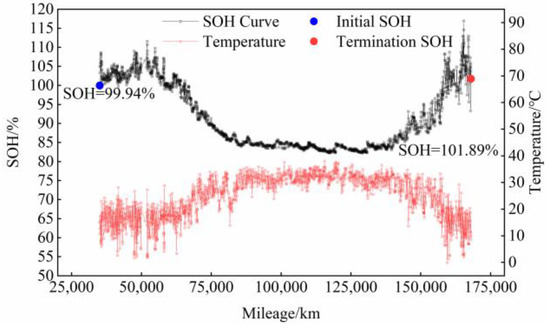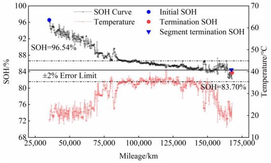 Finally, the trend of SOH variation with mileage during the entire charging period was obtained. Figure 10 shows that the overall SOH of the car battery pack was less affected by temperature and shows a continuous decline trend. At 168,023 km, the SOH of the battery pack decreased from the initial 96.54% to 81.89%. The error between the predicted results of the model and the actual values is less than 2%. In theory, as the accumulated mileage increases, the health status of the battery should gradually decline. However, due to factors such as temperature-induced battery capacity regeneration, data acquisition accuracy deviation, and SOC estimation error, the SOH value may fluctuate in actual operation. Therefore, it is reasonable for SOH values to be higher than the previous time at certain moments.