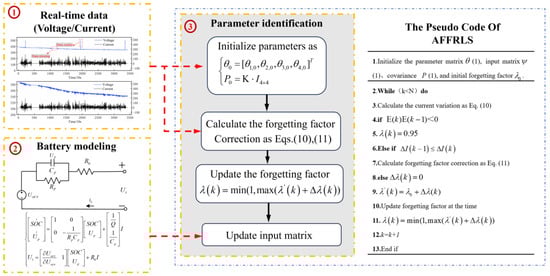 where is the gain matrix, is the covariance error matrix, is the identity matrix, and is the forgetting factor. In this method, the range of is usually [0.95, 1.00]. By multiplying the with data, the weights of new and old data can be reallocated to avoid data redundancy and alleviate the problem of data saturation [39]. As increases, the impact of historical data errors on identification results increases, and the algorithm tends towards the overall optimal solution, but the tracking effect weakens. As decreases, the tracking effect improves, but the volatility of the identification results increases. Due to the reverse and sudden changes in current caused by operations such as kinetic energy recovery and emergency acceleration during actual driving, traditional FFRLS algorithms perform poorly in parameter recognition. Therefore, this study proposes an AFFRLS algorithm that can better consider the impact of current changes on battery parameter identification. This method describes the variation of by comparing the current changes at time and . If the current change is , it indicates a significant change in the current, and the value of should be reduced to better track the current changes. On the contrary, it indicates that the change is not significant, and the value of is the value at time . The formula is defined as follows: