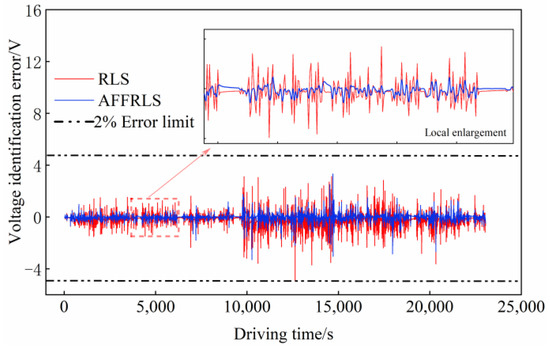 According to the above AFFRLS method, a driving segment of the vehicle is identified and compared with the battery pack voltage error based on the traditional FFRLS method, as shown in Figure 12, where the error limit is drawn based on the total voltage in the original data. As shown in Figure 12, the error fluctuation of the AFRRLS method is significantly smaller than that of the FFRLS method, and the overall identification error remains within 2% of the total voltage. This indicates that the AFRRLS method has high parameter identification accuracy, and the results obtained can be applied to subsequent tasks.