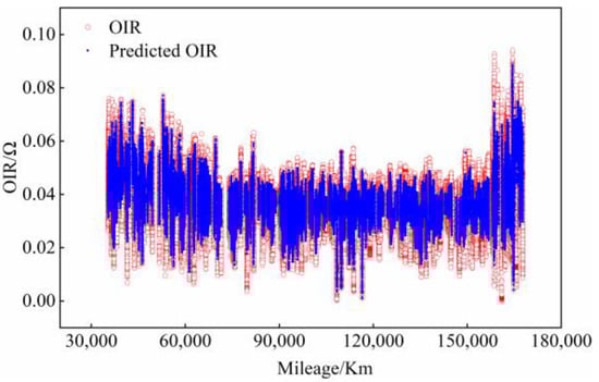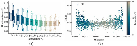 Due to the fluctuation of OIR values with changes in vehicle operating status and time, it is difficult to uniformly screen for outliers in all OIR identification results. According to relevant experiments [40], the rate of change in the OIR of battery increases with decreasing temperature and decreases with increasing temperature. Therefore, box plots were used to eliminate outliers in the resistance values at various temperatures to ensure the accuracy of OIR modeling, as shown in Figure 13a. After removing abnormal values from the OIR identification results through a box plot, the remaining OIR identification results were arranged based on accumulated mileage and temperature, as shown in Figure 13b. It can be seen that the OIR decreases with increasing temperature and increases with increasing mileage. The results show that the OIR of the identification result conforms to the law and is highly reliable.