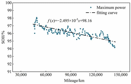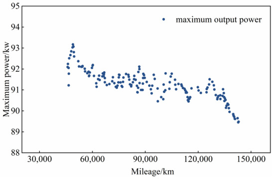 Due to the inability to measure the maximum output power of the operating vehicle’s battery, this study calculated the average of the maximum output power of each driving segment within each 1000-km interval, which was calculated as the maximum output power of the battery over a long duration. The calculated results of maximum output power are shown in Figure 14. As shown in Figure 14, with the increase in accumulated mileage, the maximum output power of the selected vehicle’ battery exhibits an overall downward trend.