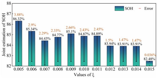 According to Equation (15), the estimation error value r was calculated, as was the temperature difference coefficient of SOH under three methods. Then, using the relationship between and in Equation (14), the joint estimated SOH value was calculated. When , it indicates that the ambient temperature is low, and the jointly estimated SOH should be based on the capacity result as a reference. When , it indicates that the ambient temperature is high. At this time, the weight allocation of each evaluation index and the influence of temperature should be considered. The final value and estimation error of SOH joint estimation for different values in the interval of [0.005, 0.015] with a step size of 0.001 were calculated. The results are shown in Figure 19.