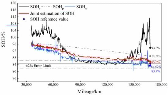 From Figure 19, it can be seen that when is greater than 0.007, the accuracy of the joint estimation of SOH is relatively close. But when is too large, the results of the joint estimation are very close to the results of the capacity estimation and ignore too many OIR and power factors. Therefore, while considering the accuracy of SOH estimation and the combination of various operating condition information, was selected as 0.013, and the final joint estimated SOH result is shown in Figure 20.
