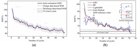 Figure 21a shows the SOH estimation results of the battery in 70 cycles, where the SOH estimation results based on charging and discharging data were obtained by the method proposed in this paper, demonstrating the effectiveness of SOH estimation-based OIR and capacity modeling. Compared with the estimation results of a single charge and discharge data, the estimation curve of the comprehensive estimation method is between the first two, and the combination of multiple indicators effectively reduces the fluctuation of the results. In addition, the estimation results of all three methods remained within a 5% error range. Figure 21b shows the SOH prediction curves of three algorithms (GRU, BP, LightGBM) based on capacity health factors, as well as the SOH prediction curve of the joint method. (For more detailed parameters, please refer to Table A2 in Appendix B) Although single factor algorithms can effectively capture the downward trend of SOH, their prediction accuracy varies to some extent and is susceptible to fluctuations. In contrast, the predicted final value of the joint method is closer to the reference value with an error within ±2, and the curve exhibits higher smoothness. Next, the method proposed in the article was applied to other vehicles of the same type. Figure 22 shows the relationship between the joint SOH estimation results of the other three vehicles and the change in mileage increment. The final SOH estimation error was less than ±2%. Overall, the comprehensive estimation method proposed in this study successfully reduces estimation errors by combining multiple indicators, providing more reliable and robust SOH estimation results than single-indicator methods.