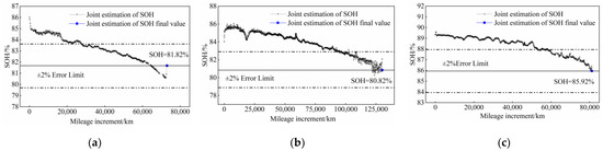 Results of SOH for the same type of vehicle. (a) Vehicle A; (b) Vehicle B; (c) Vehicle C.