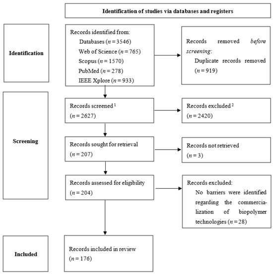 The protocol used for the present systematic review was registered at INPLASY and can be found here: https://doi.org/10.37766/inplasy2023.5.0076 (accessed on 10 December 2024). Firstly, we conducted a preliminary literature search on Google Scholar, Scopus, and by consulting team members, with the goal of creating a benchmark list of studies that could provide an initial overview of the existing literature, as well as an initial identification of relevant keywords to inform the search string design. This initial step also served to ensure that all the articles in the benchmark list would emerge through our search string. The search string was then developed considering the PICO framework, namely: (1) population—supply chain actors participating in the production, development, and commercialization of biopolymer production technologies, including industry professionals, researchers, and policymakers; (2) intervention—studies encompassing the identification of barriers related to the commercialization of novel biopolymer production technologies; (3) comparator—not applicable; and (4) outcome—qualitative and quantitative results and insights on the multiple challenges of the commercialization of new biopolymer production technologies, from the supply side. The search string was executed in four electronic databases, namely Web of Science, SCOPUS, PubMed, and IEEE Xplore, between June and July 2023. The search strings used for each database can be found in Supplementary Materials.