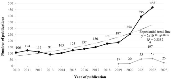 Distribution of articles over the years from 2010 to 2023. Note. ⬧ Publications considered for the present systematic literature review, retrieved from 2019 to 2023. ● Publications retrieved from 2010 to 2023 July. Since the documents were retrieved without the year 2023 having concluded, we did not include the number of publications from 2023 (n = 197) in the exponential trend line, since it does not reflect the total publications from the entire year.