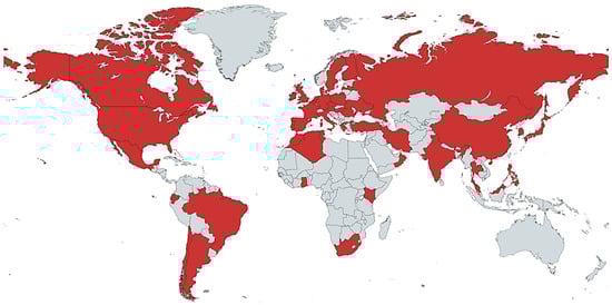 Countries in red represented in the systematic literature review. Note. Forty-four countries were represented in the included studies. Countries represented in more than one study included China (n = 19), India (n = 17), Brazil (n = 12), United Kingdom (n = 11), United States (n = 11), Spain (n = 8), Portugal (n = 8), Germany (n = 7), Italy (n = 7), Canada (n = 7), Malaysia (n = 6), Poland (n = 5), Netherlands (n = 5), Iran (n = 5), Russia (n = 4), Mexico (n = 3), France, Denmark, Sweden, Finland, Greece, Hungary, Turkey, Romania, Serbia, Argentina, Chile, Kenya, and South Korea (n = 2). The following countries documented one study: Ireland, Czech Republic, Ukraine, Latvia, Ghana, and Oman.