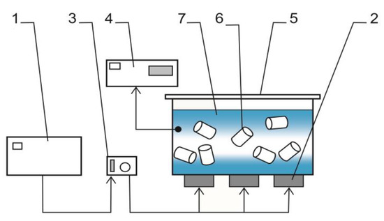 Ultrasound processing setup diagram: 1—ultrasound generator, 2—ultrasound transducer, 3—time controller, 4—thermometer, 5—tank with lid, 6—sample, 7—water. Source: own based on Śliwiński [3].
