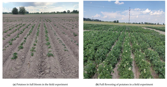 The pre-crop for potato cultivation was spring barley. Phosphorus–potassium fertilization comprised 90 kg N, 90 kg P, and 135 kg K·ha−1. In addition, compost was applied once in the crop rotation at a dose of 35 t·ha−1.