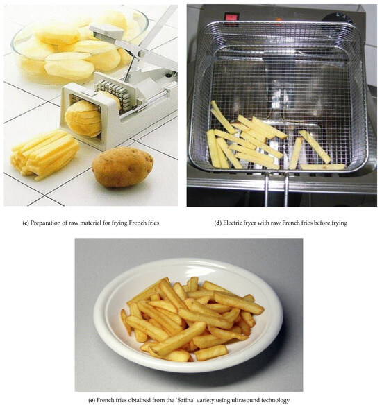 In Figure 3a–e, the subsequent stages of raw material preparation for French fry production are shown. These include planting potato tubers in the field, observing full sprouting, allowing the vegetative growth phase of potato plants, peeling the tubers, and then cutting the potatoes into French fries. This cycle concludes with the frying process and sensory evaluation of the French fries.