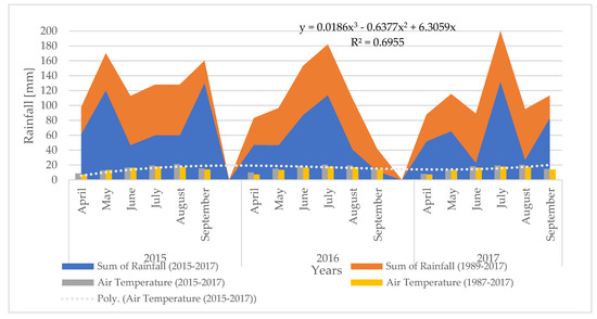 Rainfall and air temperature patterns during the potato vegetation period in 2015–2017 compared to long-term averages (1987–2017).