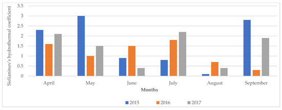Sielianinov hydrothermal coefficient during the potato growing season (2015–2017). Source: The Agrometeorological Station in Uhnin; hydrothermal coefficient was calculated according to the formula: k = 10P ∑ t [28], where P represents the total monthly precipitation in mm, and Σt is the monthly cumulative air temperature >0 °C. Ranges of values of this index were classified as follows: extremely dry, k ≤ 0.4; very dry, 0.4 < k ≤ 0.7; dry, 0.7 < k ≤ 1.0; rather dry, 1.0 < k ≤ 1.3; optimal, 1.3 < k ≤ 1.6; rather humid, 1.6 < k ≤ 2.0; wet, 2.0 < k ≤ 2.5; very humid, 2.5 ≤ k ≤ 3.0; extremely humid, 3.0 > k.