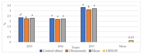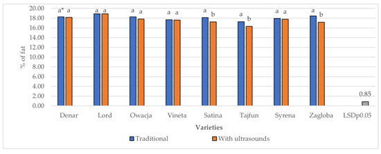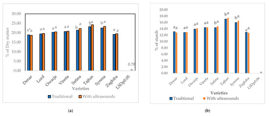 All varieties, except ‘Denar’, responded positively to the use of ultrasound, but only three, ‘Satina‘, Tajfun’ and ‘Syrena’, responded with a significant increase in dry matter and starch content, compared to traditional technology (Figure 6).