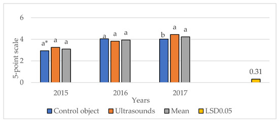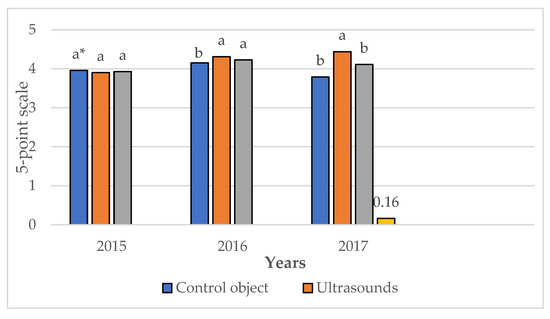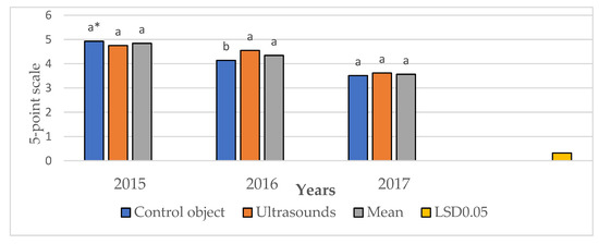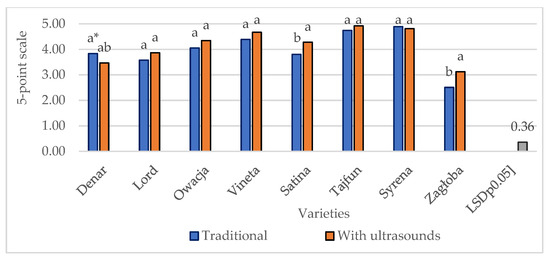 According to the results presented in Table 3, the applied technology, cultivars, and years of study had a significant effect on the assessed features of French fries, including color. A significant positive effect of ultrasound was noted in the color assessment, where the French fries subjected to sonification obtained a significantly higher score, than those from the traditional technology. In the case of potato cultivars, the highest color score was obtained for the cultivars ‘Syrena’ and ‘Tajfun’, and the lowest for the cultivar ‘Zagłoba’. Years of research also significantly influenced the assessment of the color of French fries—the best results were obtained in 2015, and the lowest in 2016 (Table 3).
