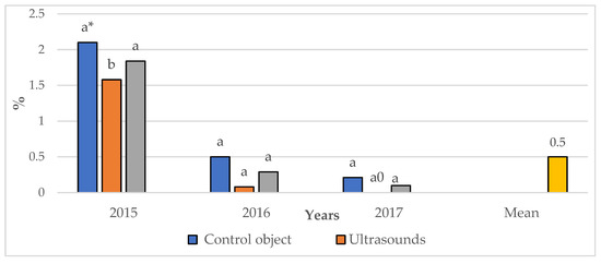 Each year, before the experiment was established, 20 primary soil samples were taken, making up one general sample weighing approximately 0.5 kg [22]. The humus content in the topsoil was determined using the Tiurin method [23], the content of available P2O5 and K2O was determined using the Egner–Riehm method [24,25], and the magnesium content in the soil was determined using the Schachtschabel method [22].