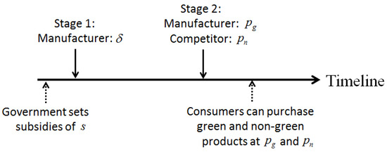 It is assumed that the manufacturer produces green units with support from the government, while the competitor provides non-green products without any subsidies. According to the government’s subsidy options, we develop two models: (a) the government supports green product adoption by subsidizing consumers’ sustainable purchases (Model C) or (b) the government supports green product adoption by subsidizing manufacturers to support their green R&D (Model M). As described in Figure 1, the sequence starts with the manufacturer deciding whether to introduce green versions of their products. Then, both the manufacturer and the competitor simultaneously choose the optimal prices for green and non-green products, i.e., and , respectively.