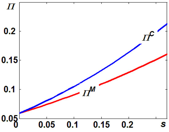 Proposition 1(i) reveals that the subsidy levels and selling costs lead both the manufacturer and the competitor to decrease and increase their selling prices. On the one hand, Proposition 1(i) confirms that the selling prices of both products increase with the selling costs (); that is, and . This is quite intuitively consistent with traditional wisdom. However, Proposition 1(i) further reveals that the subsidy levels lead both the manufacturer and the competitor to decrease their selling prices. The reason behind this can be interpreted as follows: Subsidizing the manufacturer means that there is a decrease in the cost of green R&D because a portion of the cost is borne by the government. When the subsidy level increases, the manufacturer would like to decrease the price of green products. Observing decreases in the prices of green products, the competitor has no choice but to decrease its optimal prices as well.