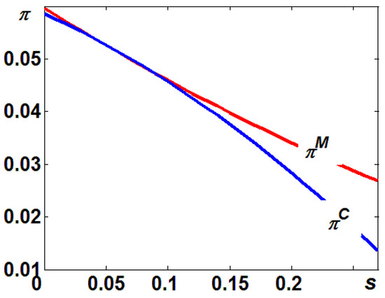 However, as shown in Figure 2b, we can conclude that , meaning that the competitor confronts fiercer competitive pressure from the green products; that is, when confronting the fiercer competition from green products, i.e., , the competitor has no choice but to provide fewer units of non-green products in Model C. The reason for this can be interpreted as follows. On the one hand, as shown in Proposition 2(i), in Model C, if the manufacturer increases the prices of green products, i.e., , as a response, the optimal quantities of green products naturally increase (). On the other hand, in Model M, if the manufacturer decreases the prices of green products, i.e., , as a response, the optimal prices of green products naturally decrease (). Furthermore, the different implications of the subsidy policies between Model M and Model C mean that the optimal prices of both products under Model C are always lower than those under Model M; that is, and .