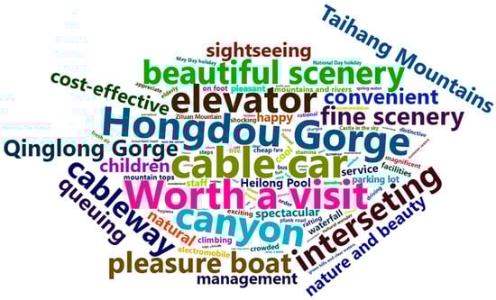 - The results show that tourists attach great importance to the ecotourism experience. Natural attractions in the scenic area, such as “Baquan Gorge”, “Hongdou Gorge”, “Qinglong Gorge”, were repeatedly mentioned by tourists. High-frequency positive adjectives such as “beautiful”, “mountainous”, “spectacular”, “shocking”, “airy”, “scenic”, and “pleasant” are also mainly used to describe natural scenery. This indicates that the natural landscape of the Shanxi area of the Taihangshan National Park has great attraction for tourists.