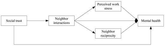 Social trust affects young adults’ neighbor interactions, thus influencing neighbor reciprocity and perceived work stress, and eventually has indirect effects on mental health.