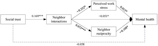 The mediating effects of community sustainable characteristics between social trust and mental health. * p < 0.05, *** p < 0.001.