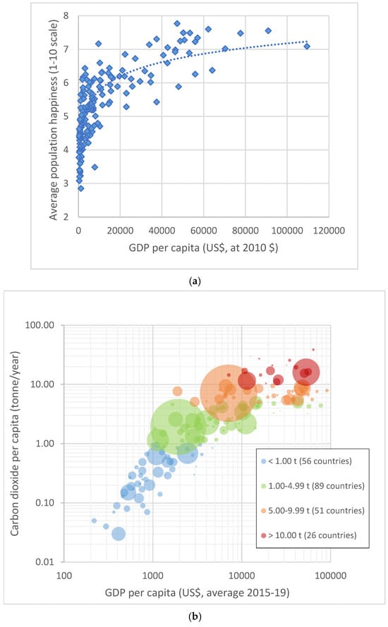 (a). Country GDP per capita (mean 2015–2019) and population happiness (2018) (n = 151 countries). (b). Per capita GDP and carbon dioxide emissions by country.